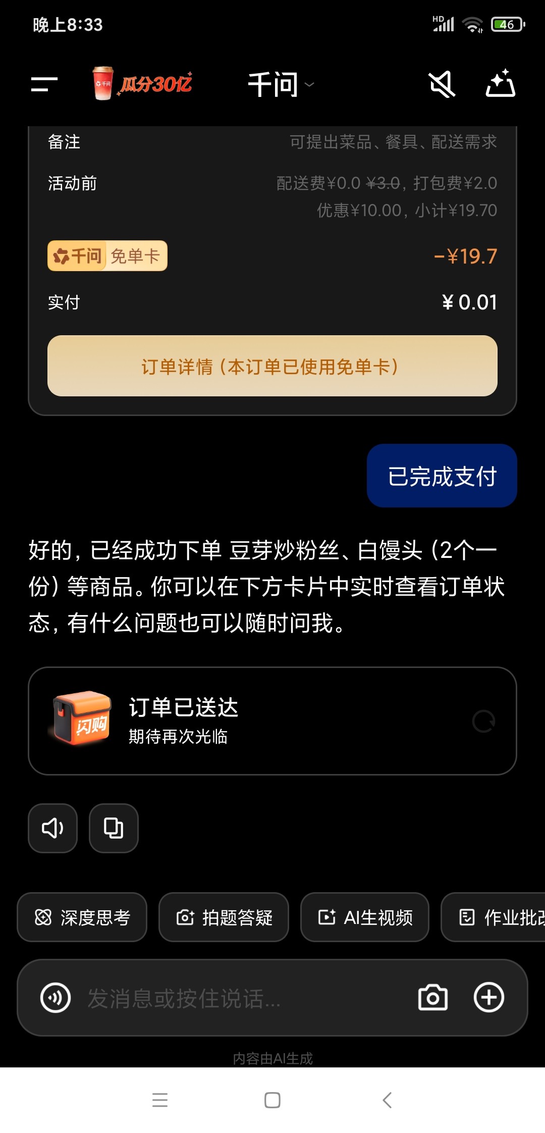 出现可以点的店铺和菜后,点进去,自己挑菜品,默认使用25的劵,然后重复下单,直到下单完成为止,会从你手机号的支付宝自动扣款,我点的0.01就是0.01,支付完成后提示系统卡顿不要怕,登录淘宝就可以查看刚才的订单了