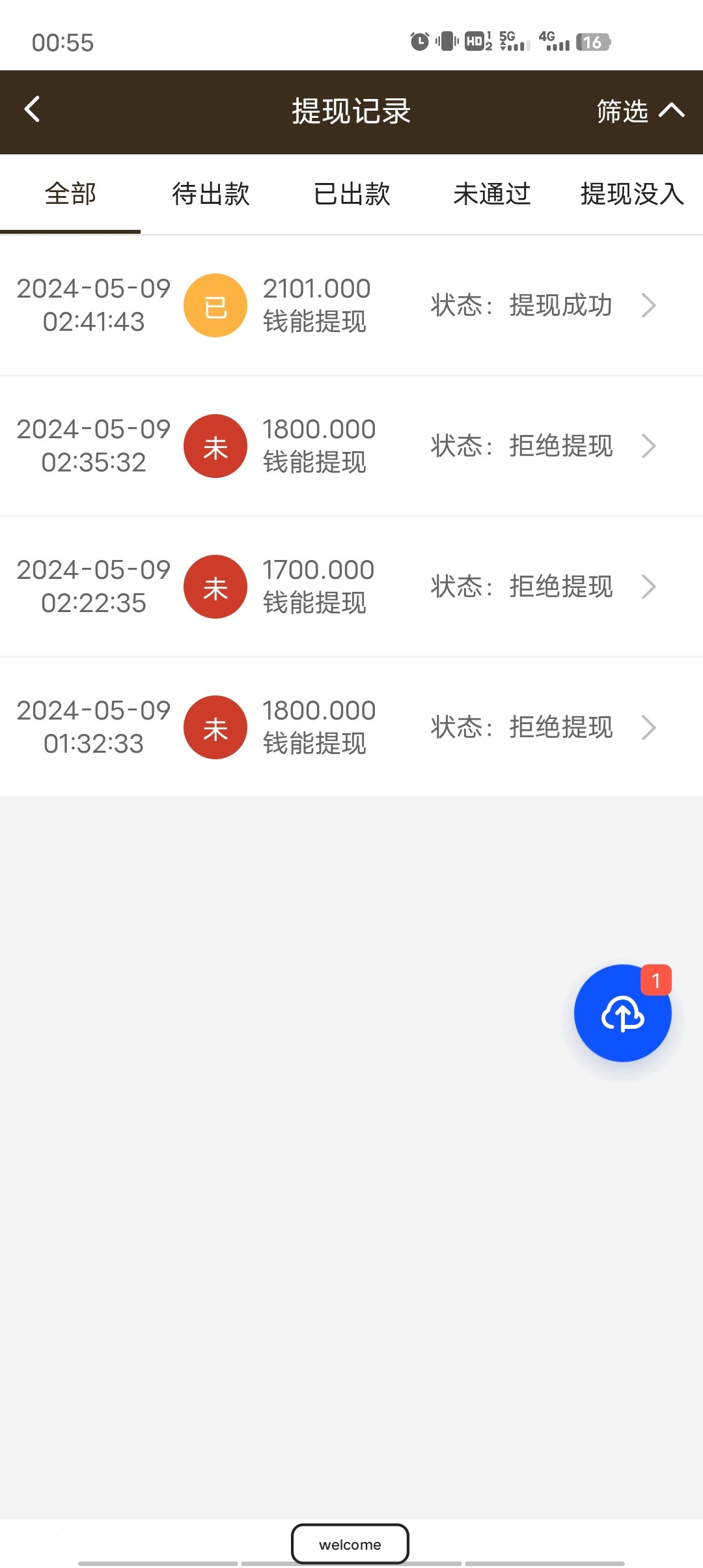 第一次时候就二块钱赢了1.8k给了手持出了 这次五一送的彩金38也出了2.1k 以为这次不可能提现的了 没想到还给两分钟就到钱包了