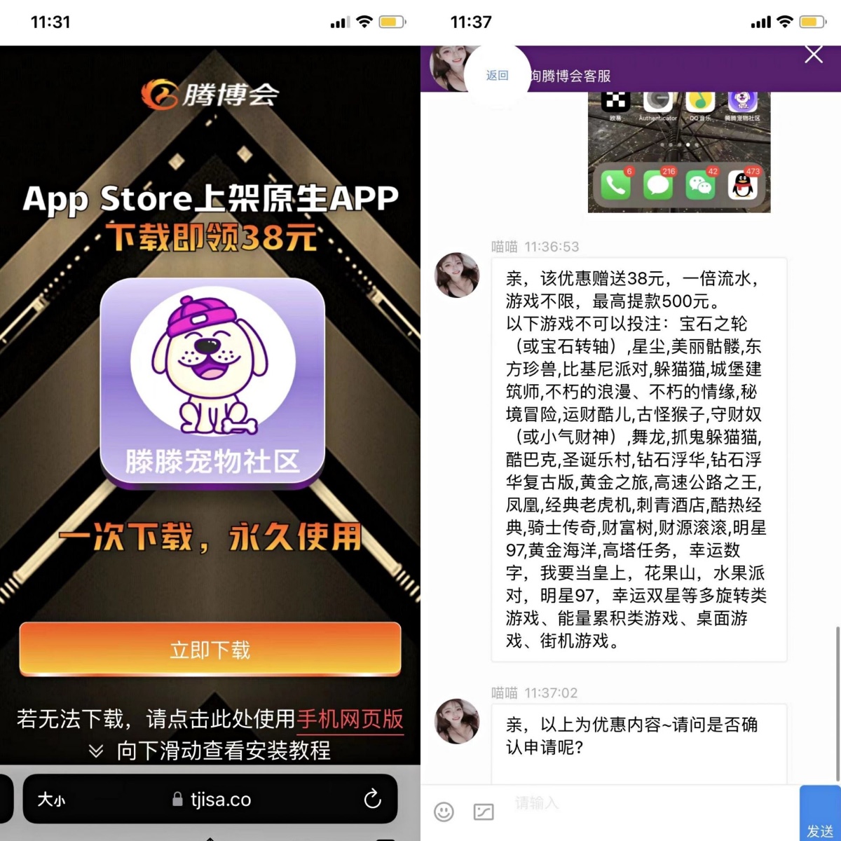 苹果手机用户下载APP登录后联系在线客服发送下方第一张图给在线客服申请38元。安卓手机无视。