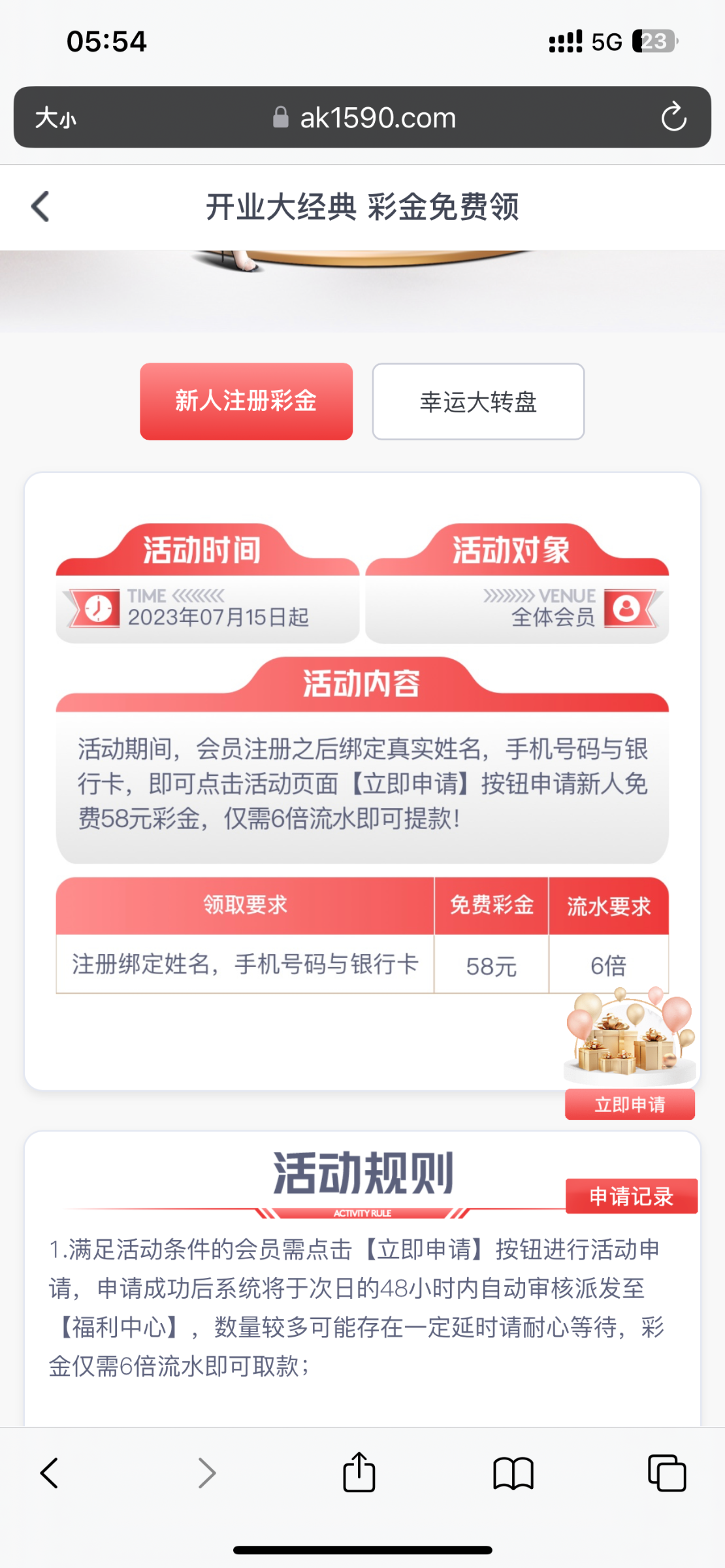 注册绑定姓名手机号码与银行卡 优惠里找到开业大庆典 申请58元 6倍流水 申请后48小时内送到福利中心领取 没有无视 跟完美体育差不多