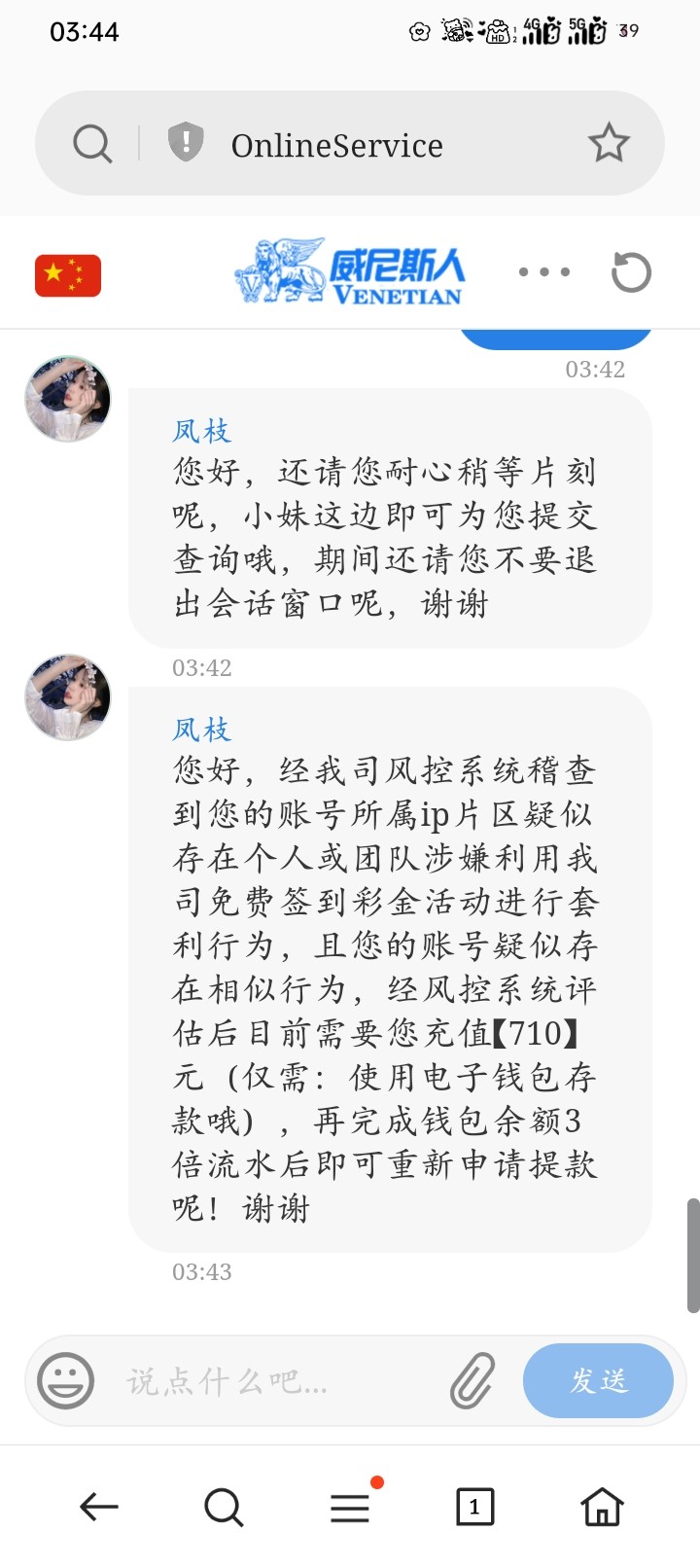 这个台子就是个垃圾  签到都给我关闭了  我签到彩金  打到了1500  喊我充一百  我不会充  并不是我没钱  是真的被黑怕了  第一个威尼斯那种66开头的  黑了我一千三  我五百打上去的  说我ip异常  这种台子个人建议不要充  不要去玩威尼斯  能出都是小额  大额不会出  唯一就是水是真的大