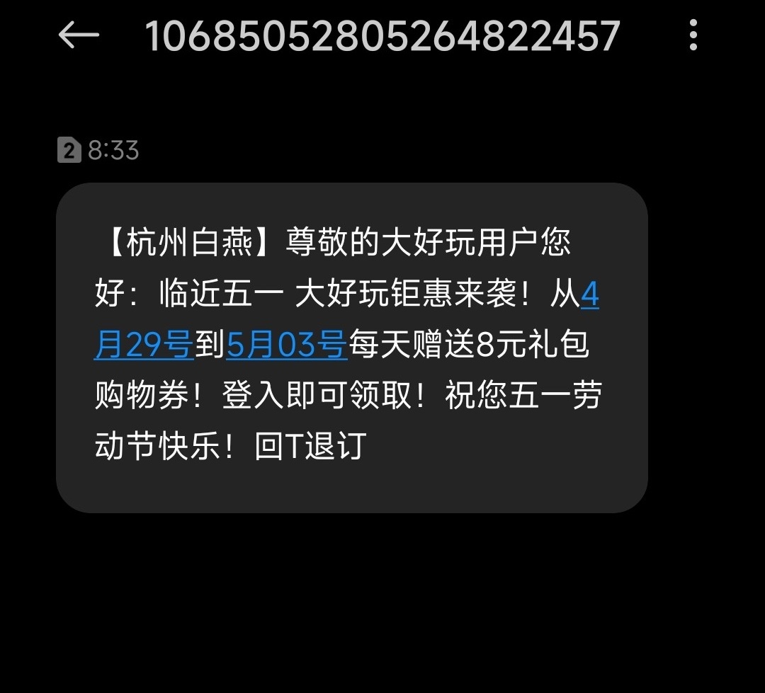 有下方短信的4月29~5月3每天登录送8,有号的都去看看