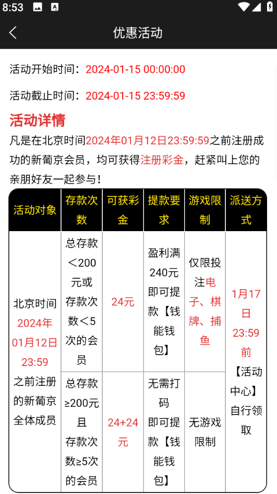 凡是在2024年01月12日23:59:59之前注册的,均可获得注册彩金(24+24)!另外还可以申请新人注册绑卡然后下载APP