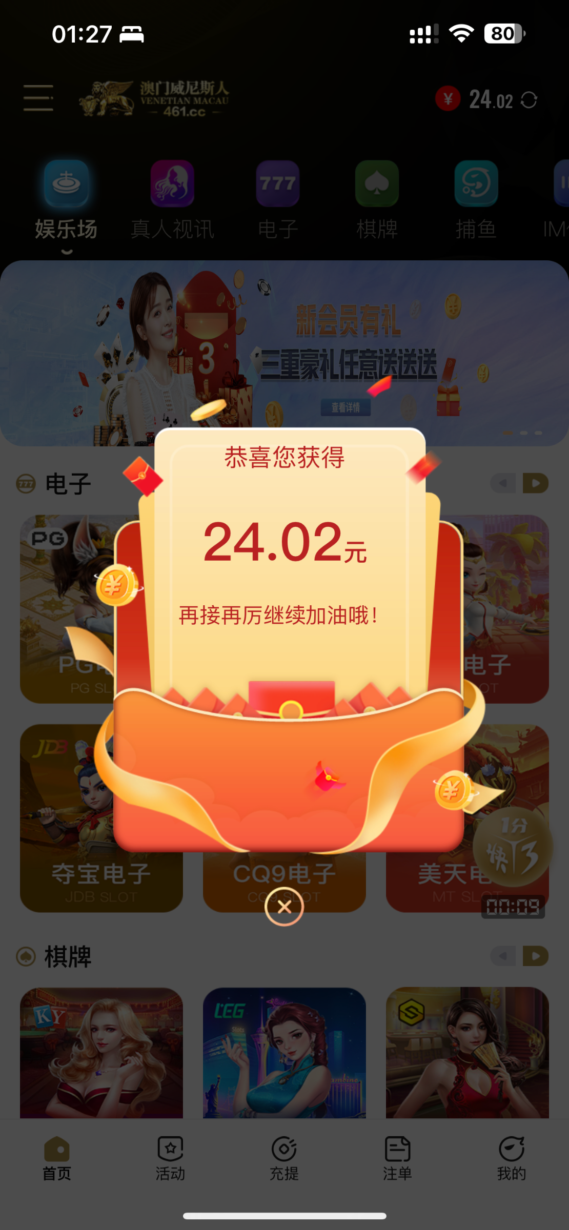 新用户先下载app再注册 切记否则不送 注册秒送20+红包自动弹出来 没送就是不符合 亲测送了 无游戏限制 最低提款100元 最高提款168元 只能提款一次