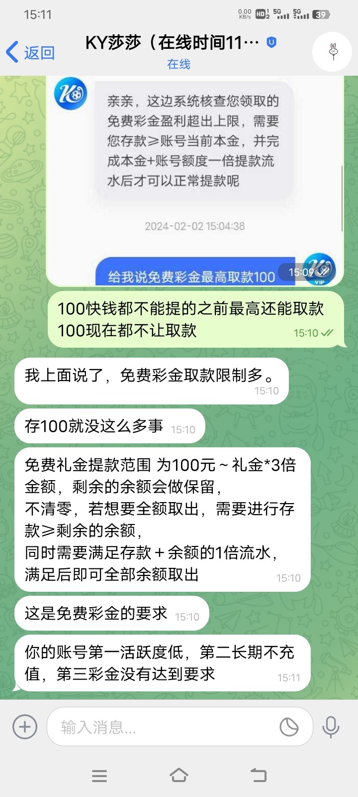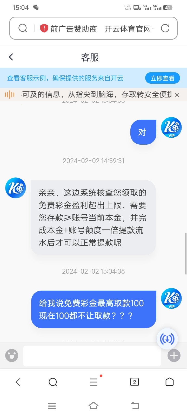 死马的开云打电话送58,结果打380让充值一倍以上打码,然后输到100也提不了给我退回,太黑了100都不给,之前送的能取款最高100,现在开始杀猪了一毛不拔