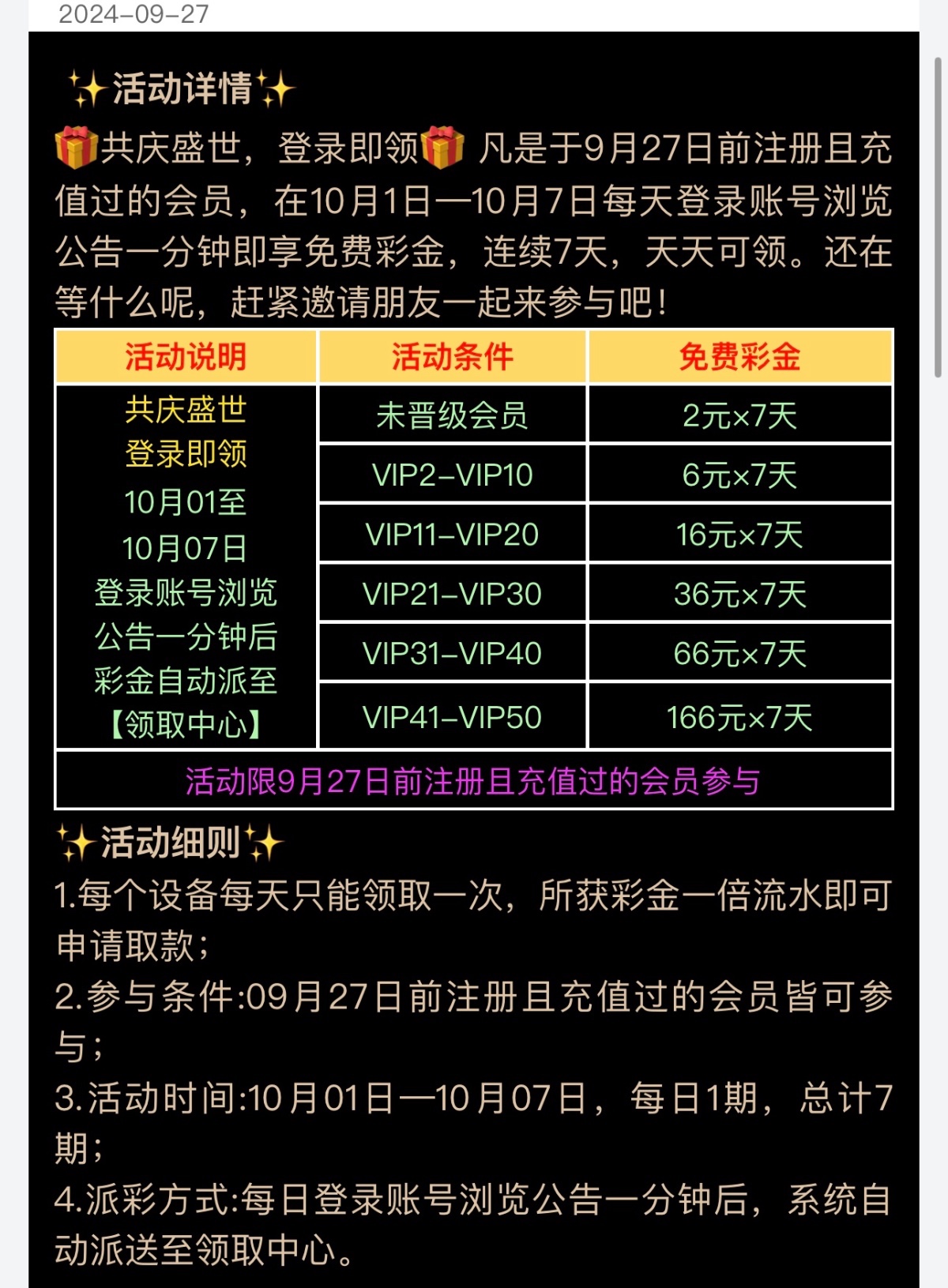 国庆期间七天每天录看一分钟公告,免费送彩金,具体看下图