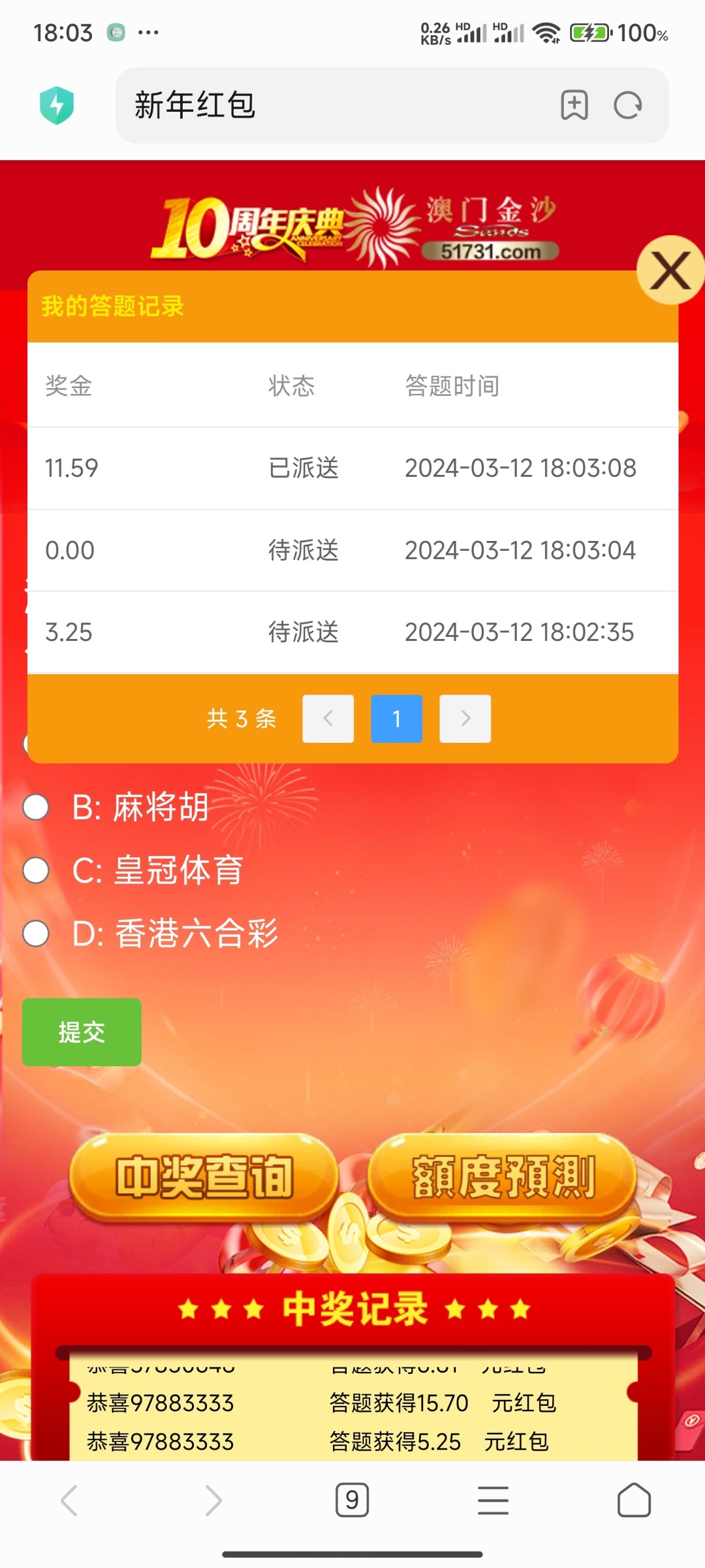 登录答对了才有奖励,登录送三次机会注册好了找在线客服申请三次答题机会,然后客服会给你链接去答题,答题先填自己 id 没有机会就跟客服说,客服会给你机会的,答题都是活动里面的,不知道就去看活动,那个热门游戏的答题是麻将胡了