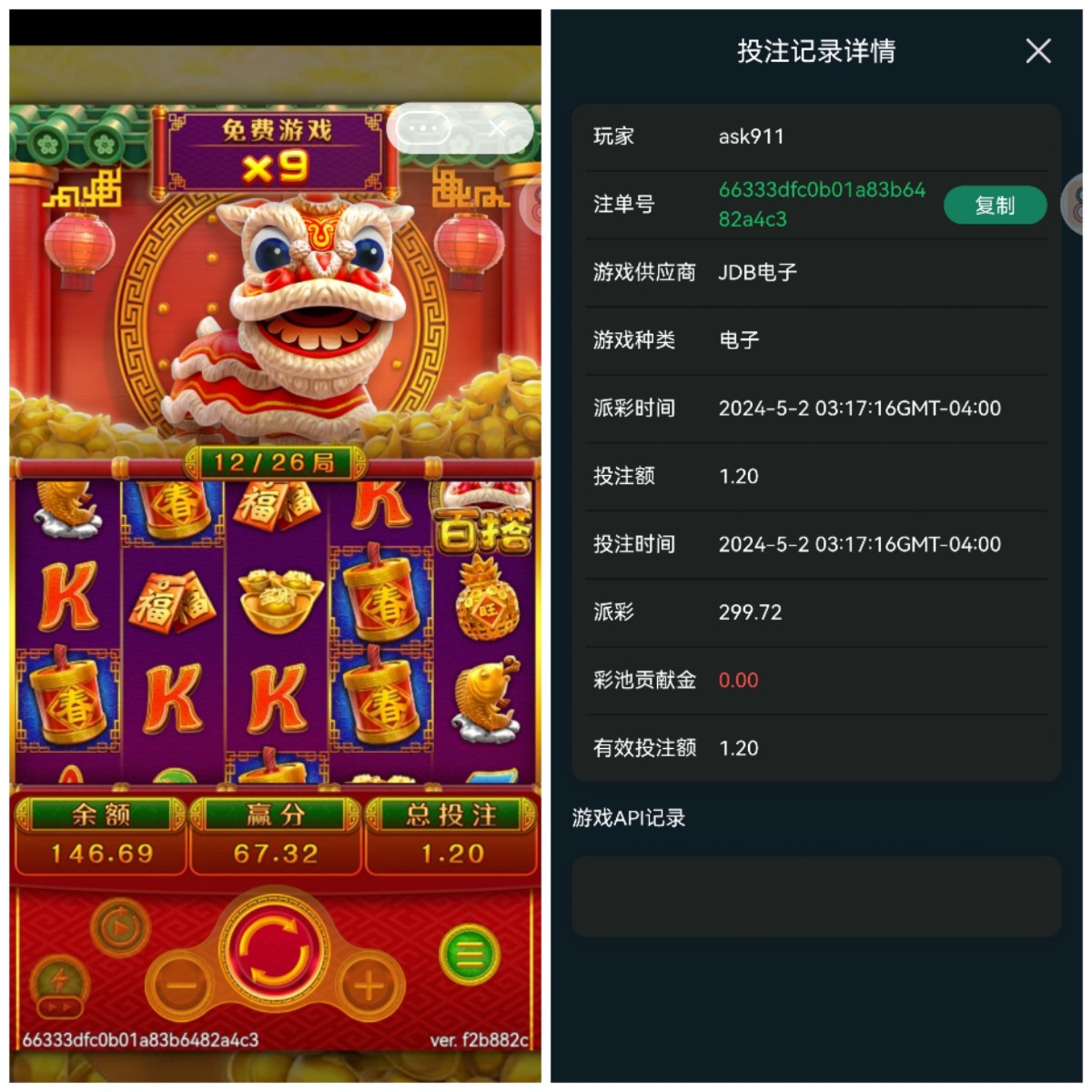 刚注册搞的新会员首存100+18,jdb大过年免中免费,爆了将近300倍(这app老是莫名其妙闪退。以为这个免费打水漂了,还是给到账)