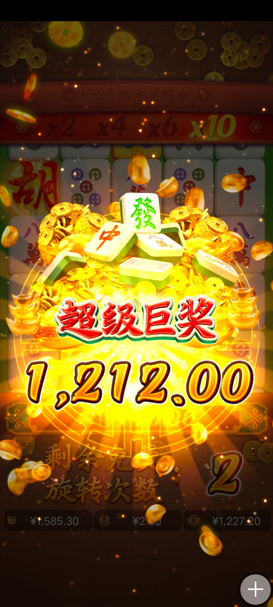 麻1进胡给了个免中免,空转到最后爆了个高倍,这两天爆了一个700,爆了一个600,说白了只是视觉上观感很好,算下来自己还是负盈利,身上钱不多了,只能拉2块的过过手瘾