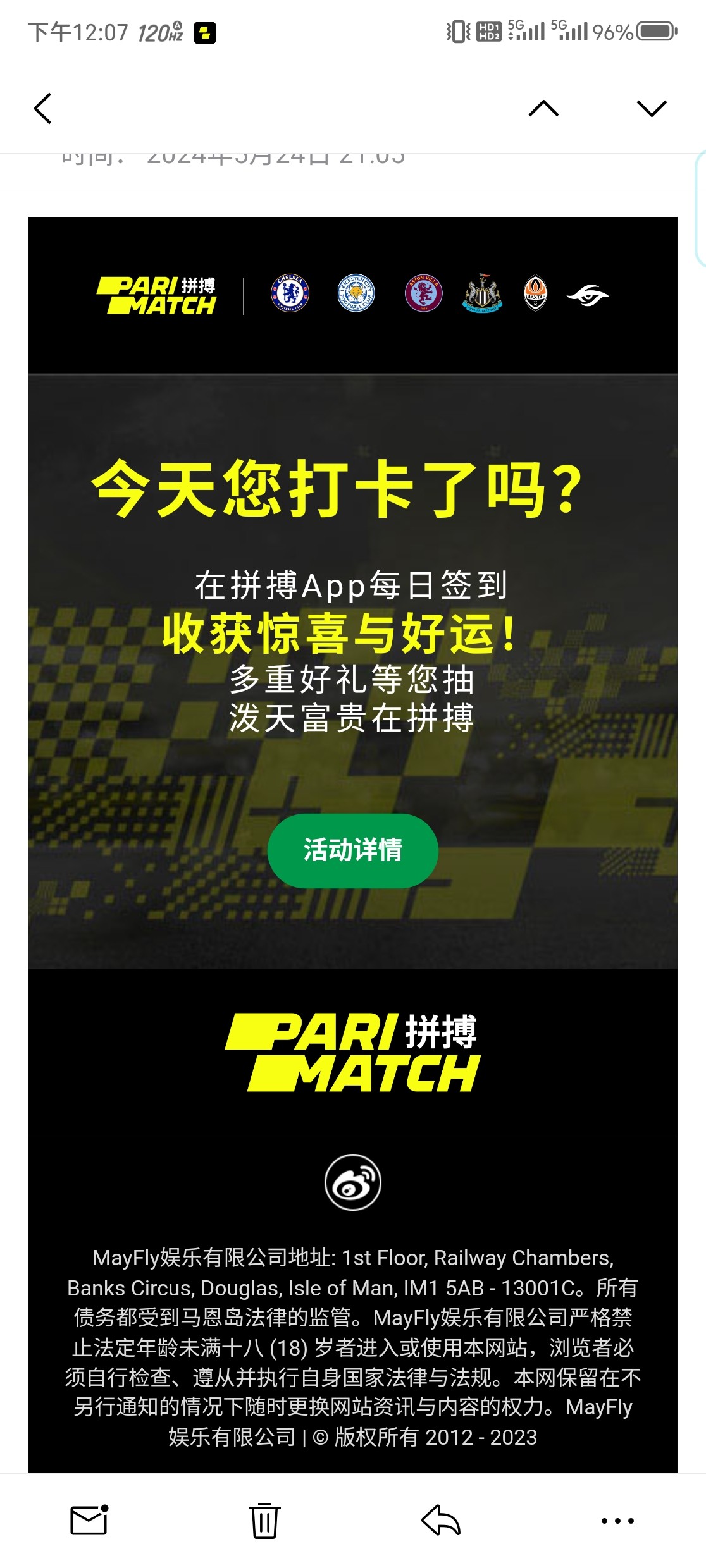 拼博老玩家有签到彩金,可以看注册邮箱的通知,如果没有的话我建议有账号的登录一下,过两天可能就给你发优惠邮件了。