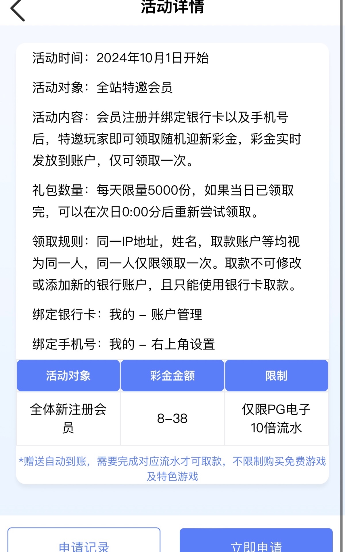 新用户注册绑定手机号,绑卡优惠里自助申请送8-38 每天限量5000份,如果当日已领取完,可以在次日0:00分后重新尝试领取。勿充值