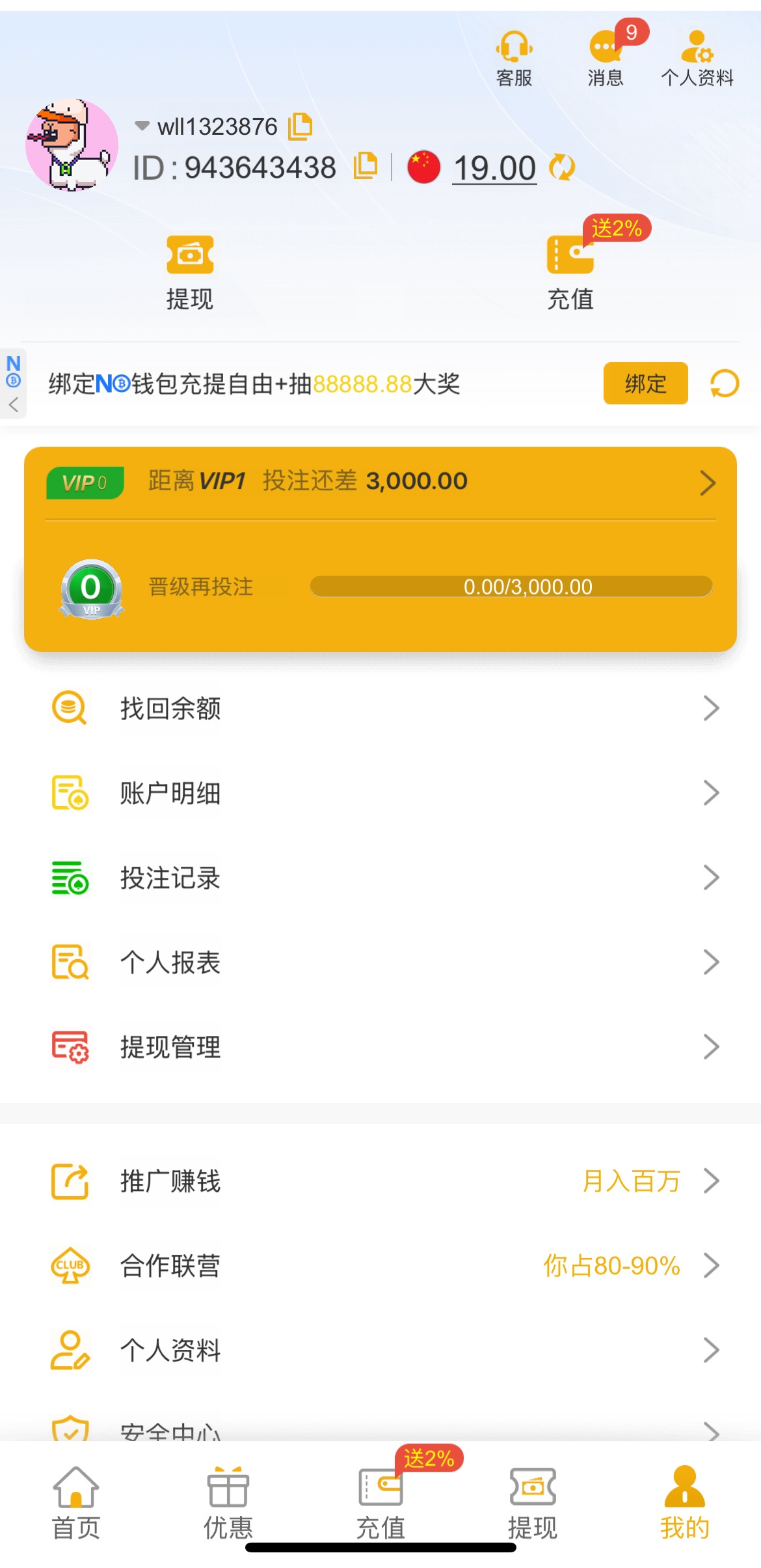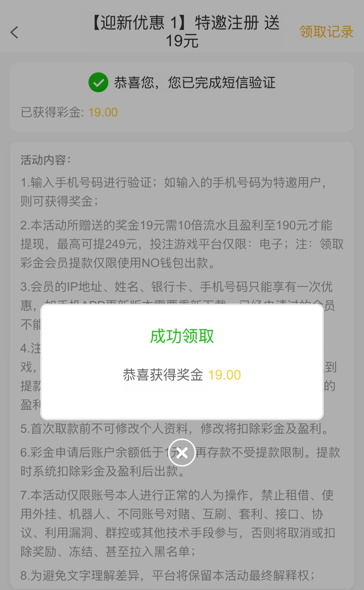 短信特邀下载注册活动里面领取19特邀彩金收到短信去也可以去碰瓷
