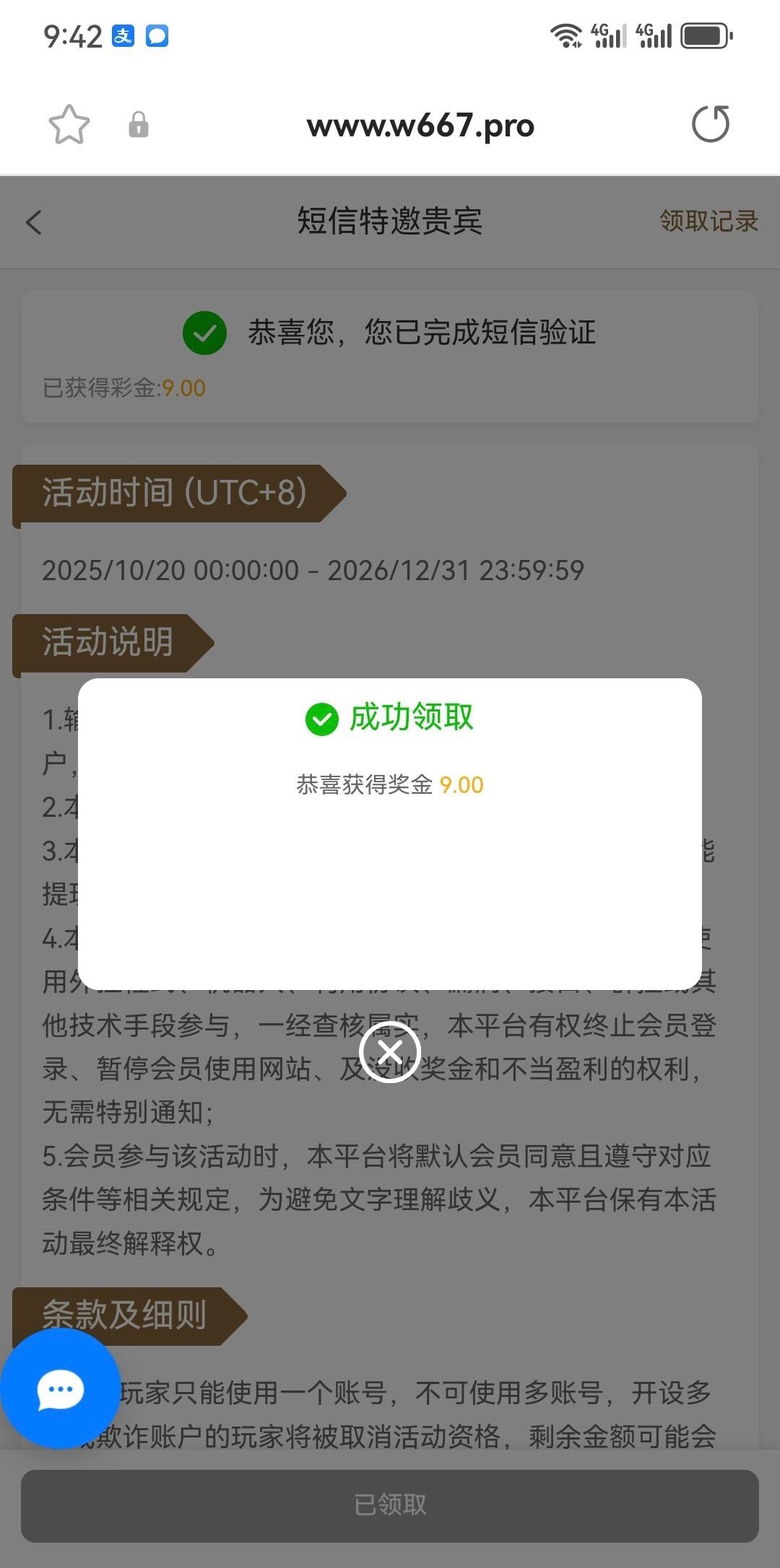 之前送38要充值,现在送9验证就能领。注册直接去活动输入手机号能发码再去绑定手机号!网址w667.pro