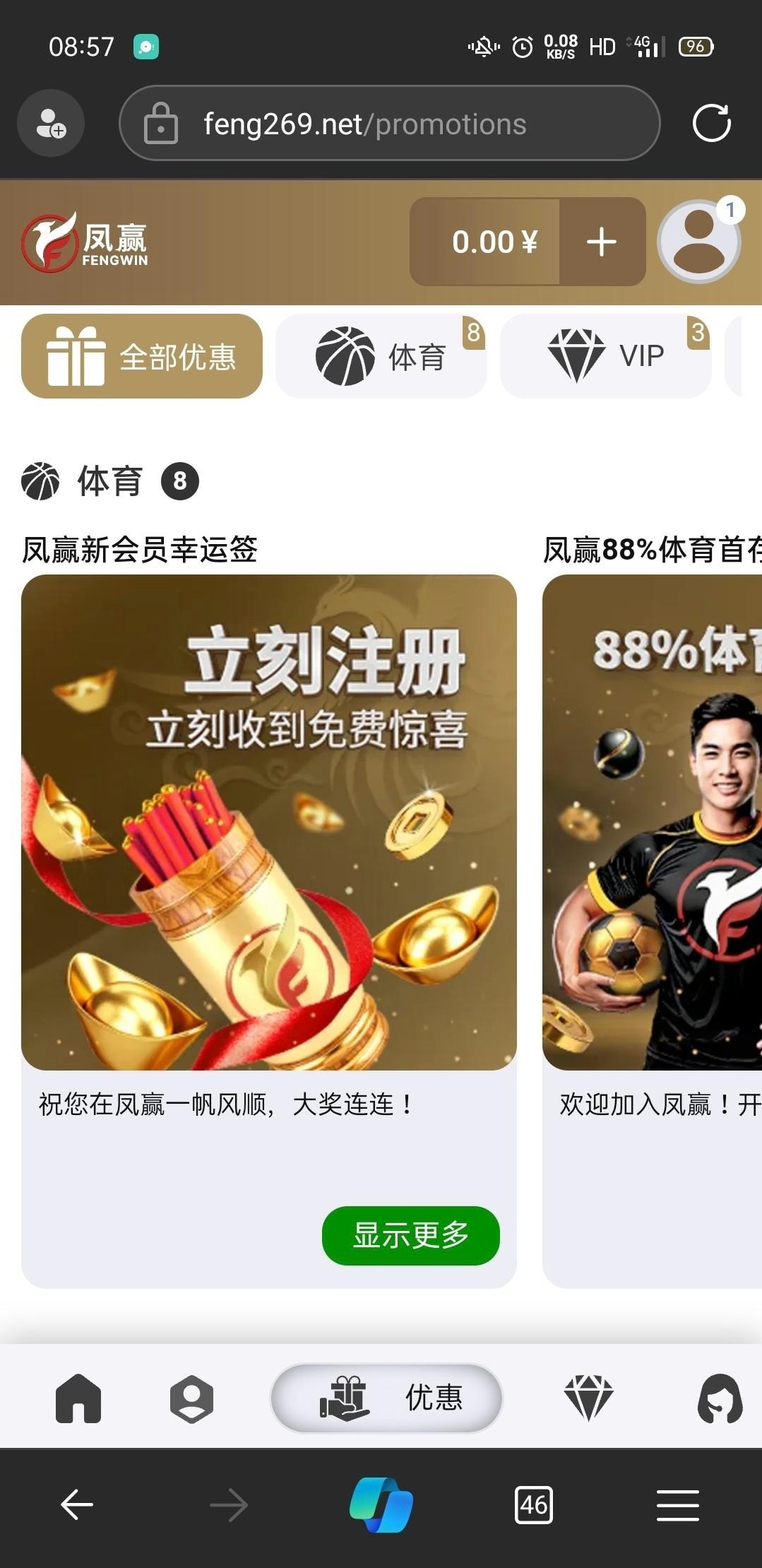 注册自动在个人中心,优惠活动抽取免费彩金。我抽到8块体育彩金。还没玩,出款自测。网址http://fengluck.com/