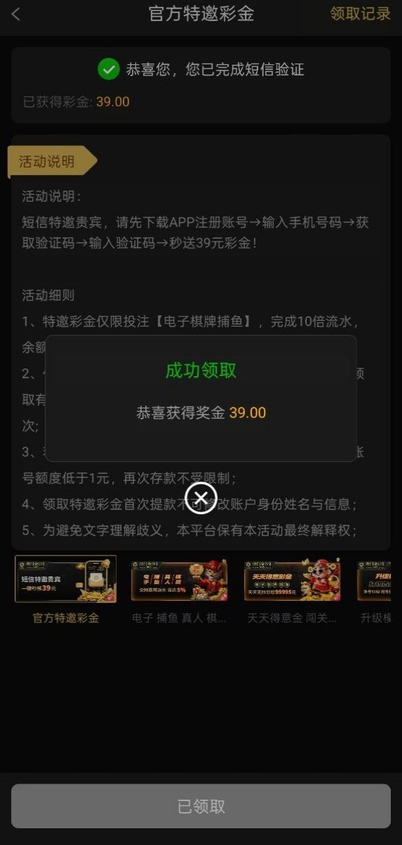 新用户注册验证手机号特邀秒39彩金,具体规则自测吧