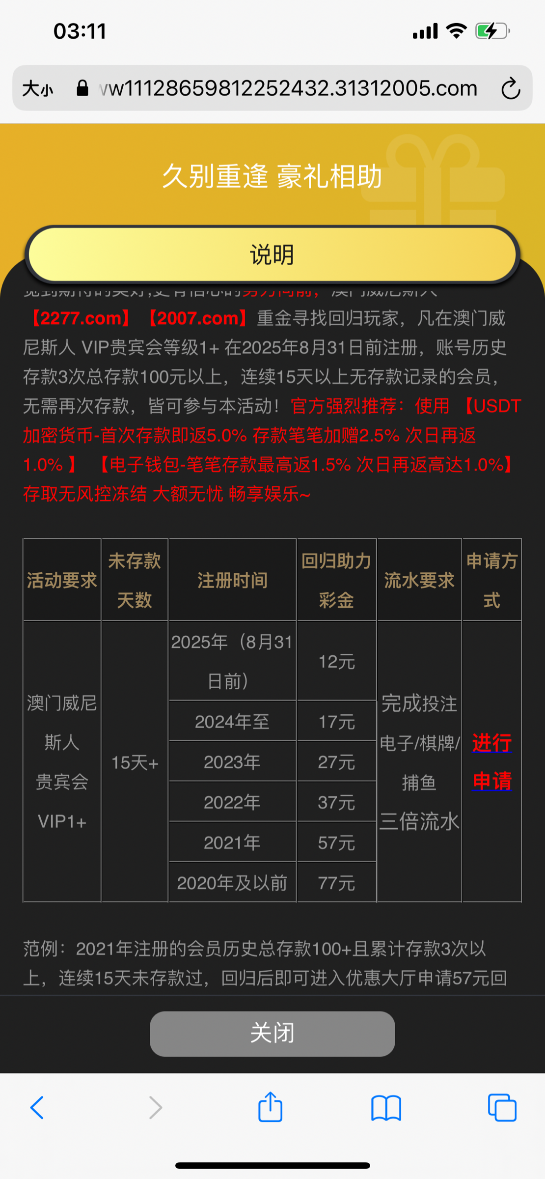 要vip1及以上才能申请,15天未存款,按注册年份申请,很奇怪,也不知道他们是从什么时候开始算的,以前我一晚上返水也100多还经常玩,居然没有vip等级,郁闷,玩过的老铁赶紧申请
