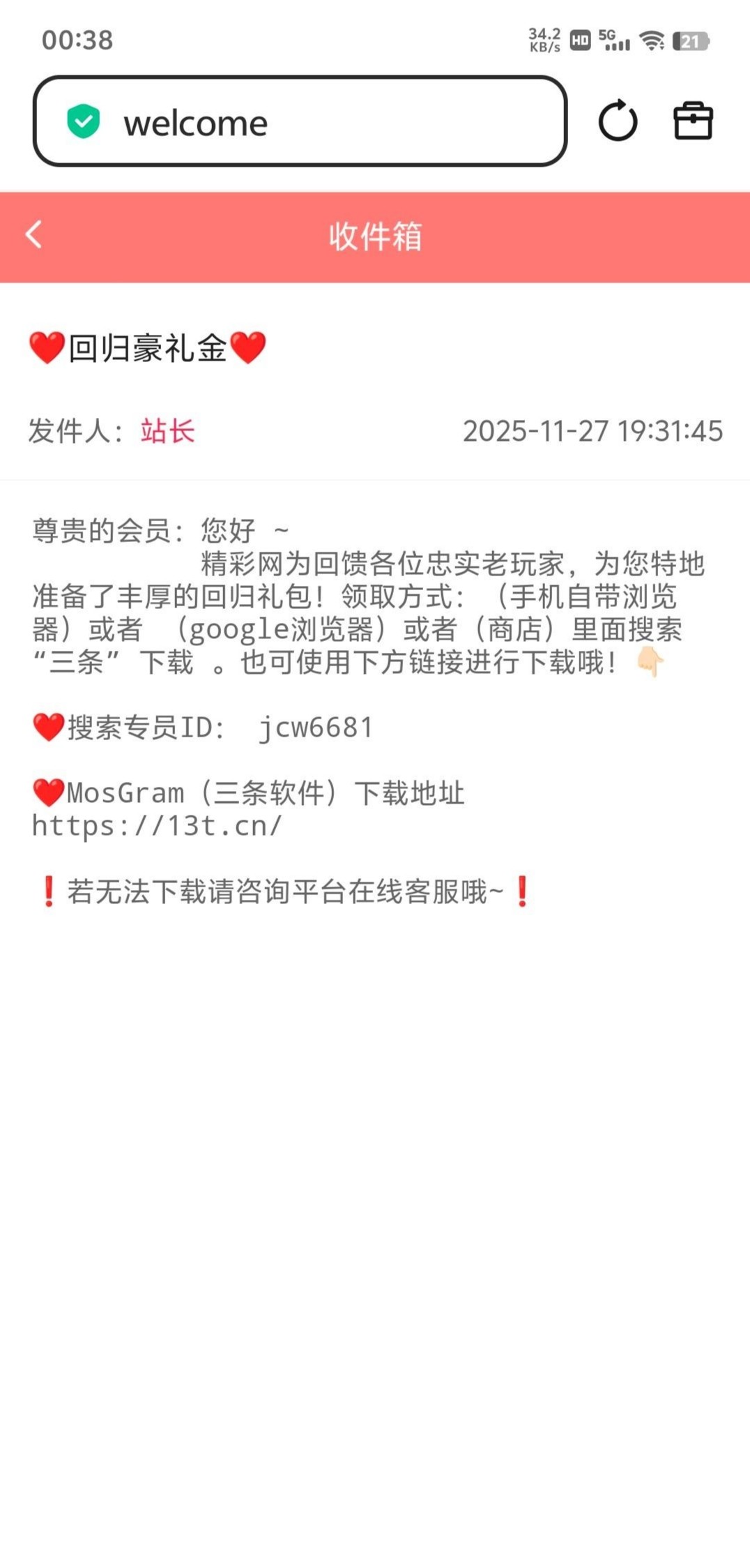 站内信看看有没有邮件,我两年多没玩了登进去看一下有回归彩金,要联系三条专员网址 www.668.com