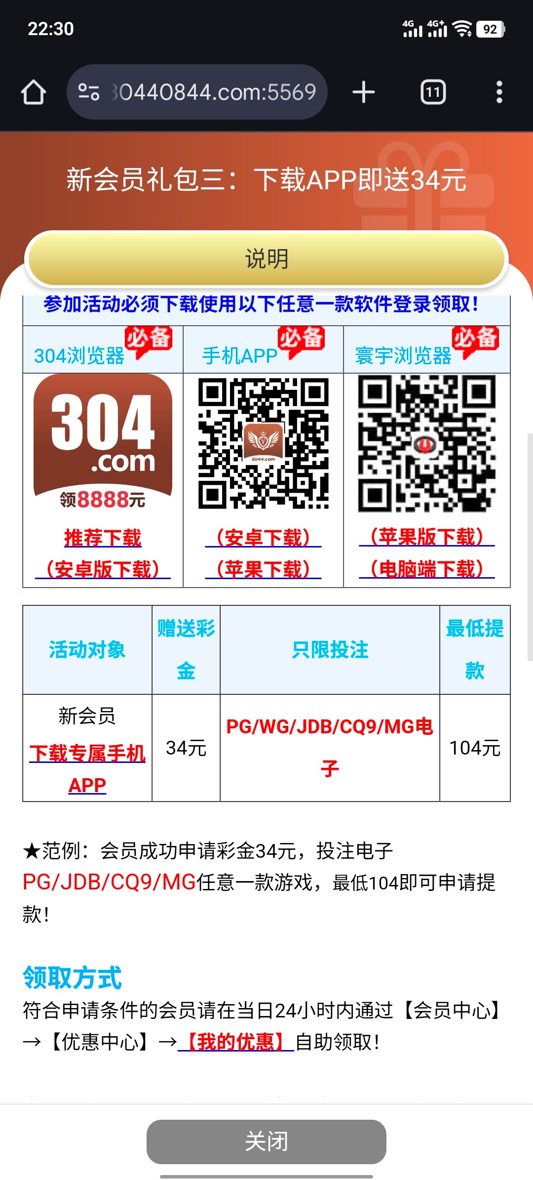 会员成功申请彩金34元,投注电子PG/JDB/CQ9/MG任意一款游戏,最低104即可申请提款