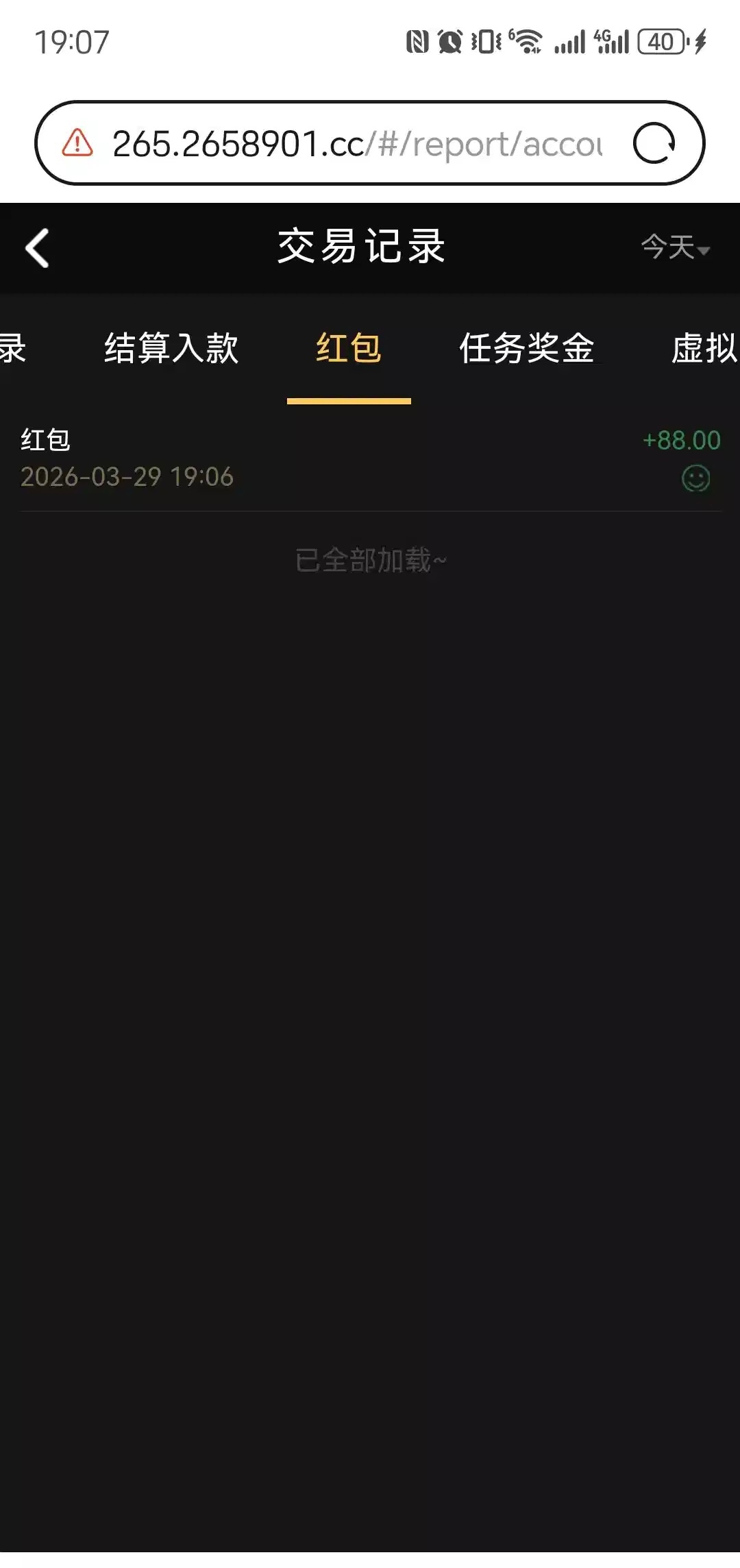 给我打电话了,登录就有红包,点了就是88,没有打出来,不过应该要下载app的,这个台是假pg,之前下过三四千都没有黑265.2658901.cc