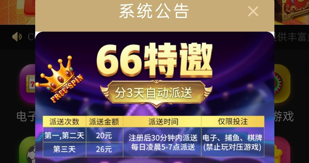 新用户注册绑卡注册弹框秒20,或者等半小时看看,第二第三天送20/26,不能玩对压,自己去碰瓷试试,经常玩开元的应该有,100提