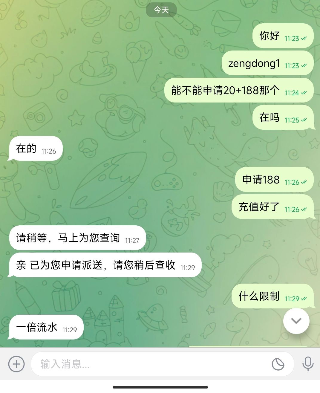 老用户登入账号,用数字货币充值20+送188,一杯流水,不限制游戏,最低50提现,以出款,看图,新用户要游戏一段时间才可以申请。