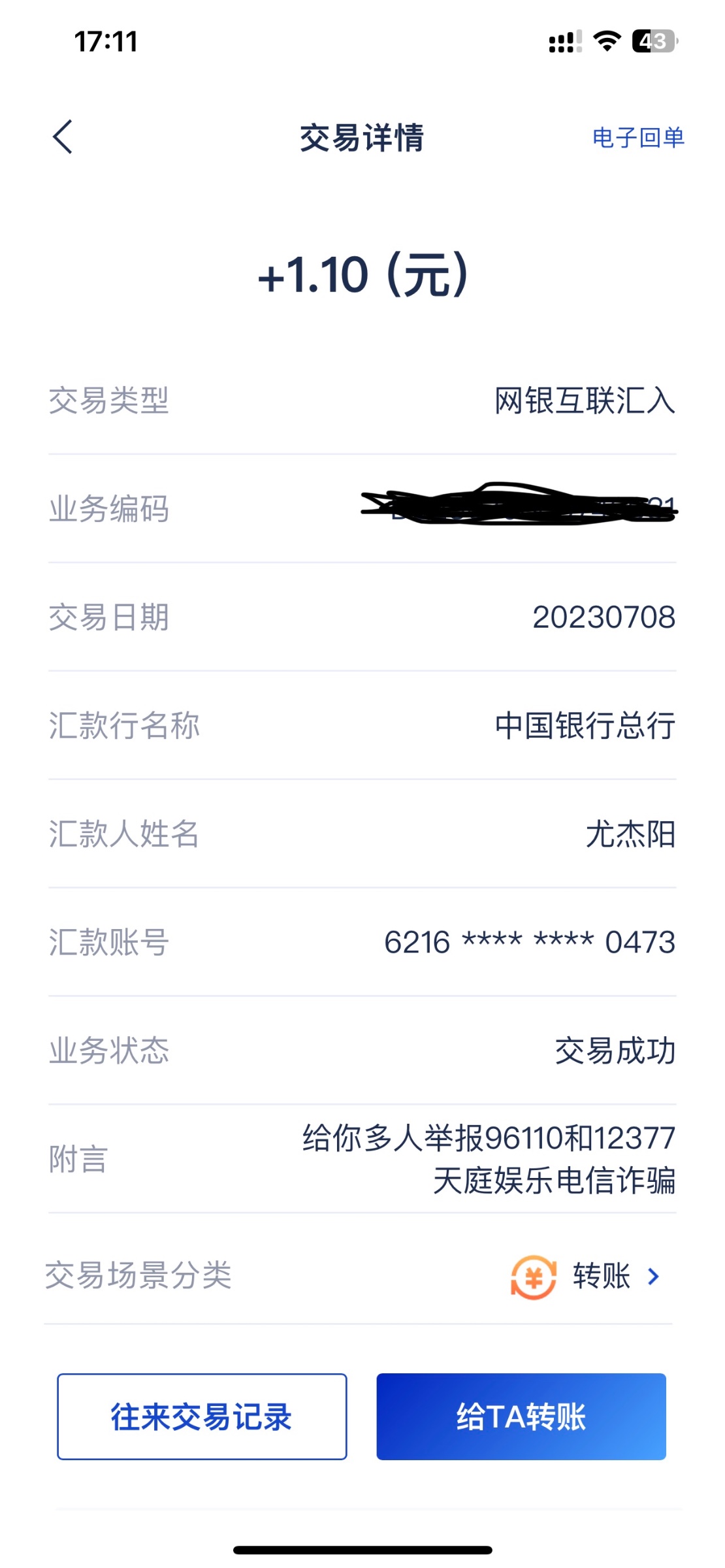 6月27日打比赛奖励打到300提出来,真的衰遇到尤杰阳这个出生给我打款了,顶级这个系列的公司入款就是给玩家出款的,本来我认为这样很好,大概率不会收到黑钱,但是遇到撸公司入款的就很麻烦,遇到尤杰阳这个出生,对顶级系列提卡有点担心,可能有些出生输不起可能去报警什么的,一开始没看到这个出生给我转账附言,我今天才看到,三天给我转0.11、 0.22、1.1、0.11、0.11然后附言,我怕这个出生不死心,所以把卡销户了,电子卡的,我不注销可能也没事,但这个出生每天一两笔转给我,我看着都恶心,因为打比赛奖励只能提卡,不然我提u就可以了,我是在k1提的300,你们看这出生的附言,我之前我在卡农看到一个出生说给顶级系列的卡号转账然后附言,当时我看到它这话觉得特别恶心,没想到现在遇到了,都是玩家的卡号搞这种事真恶心。
